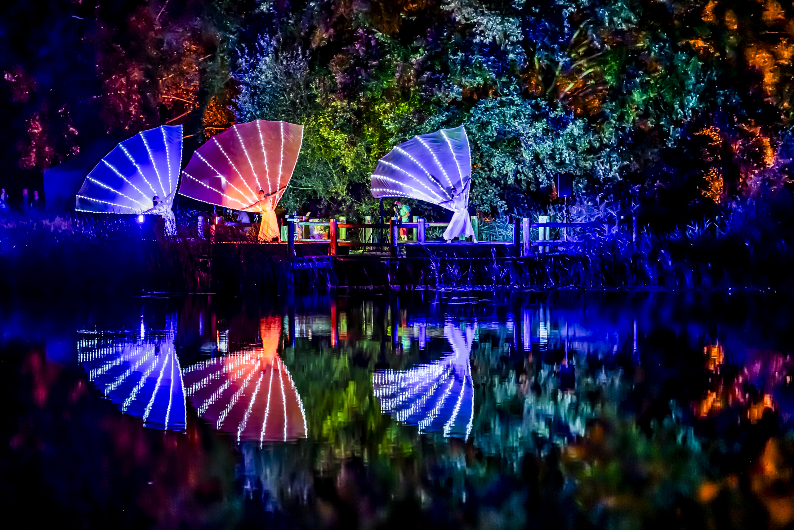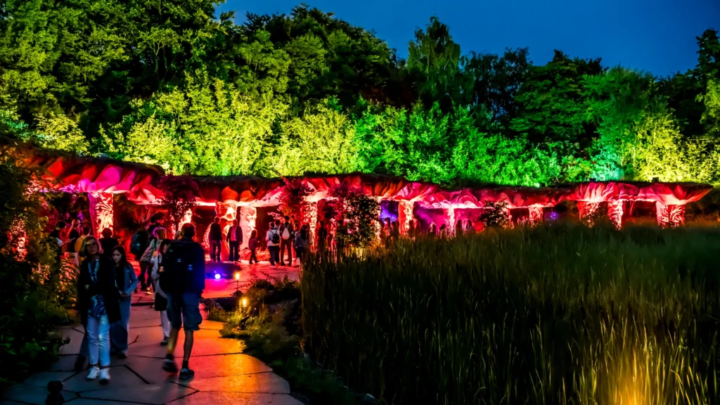 Künstlerisch gestaltete Erlebniswelten laden Sie dazu ein, innezuhalten, zur Ruhe zu kommen und selbst Teil der nächtlichen Szenerie zu werden. Aufwendige Lichtinstallationen verwandeln den Garten in ein lebendiges Kunstwerk: Bäume, Wasserflächen und Wege werden kunstvoll illuminiert, Schatten bewegen sich über die Wiesen und leuchtende Farben setzen gezielte Akzente.